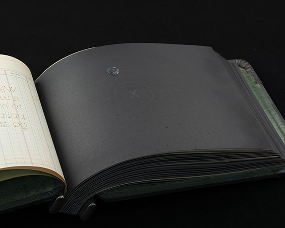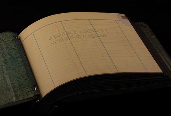 Found accounting ledger, laser cut paper, lead shot, graphite.