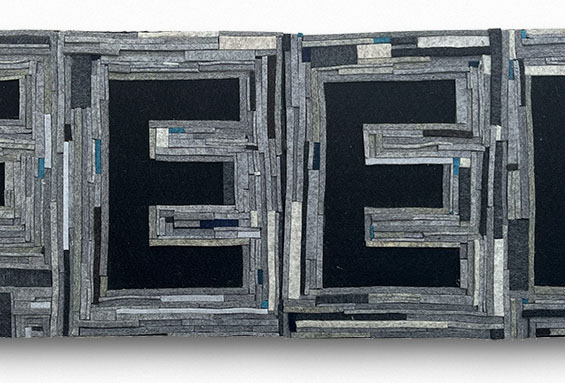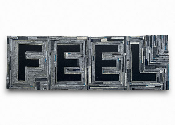 Feel is a study in grief. Scraps of felt are pieced together to capture the fractured state of grief in which we enforce order just to function. The gray colors capture the crowded thoughts of grief with occasional reliefs of color becoming more frequent.