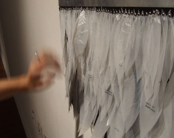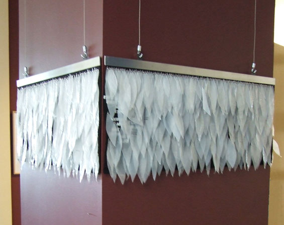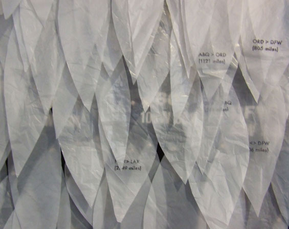 Each feather shape is individually cut from discarded plastic shopping bags and alludes to flight. The lightweight material floats with the slightest motion lending a poetic quality to the work. Each is attached to the felt by a silver brad. The row of brads alongside the aluminum bar recalls airline rivets and further alludes to flight.