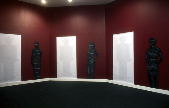 Ideal Match is inspired by the rise of on-line dating communities. In this format personalities and needs must be summed up for evaluation in less than 300 words. The work consists of four heterosexual “couples.” The man in each couple is made up of a collection of on-line descriptions of “ideal mates” written by single men that matched the criteria of the corresponding woman. These text portraits contradict the myth of the allusive bachelor by revealing his vulnerability. Each woman is the silhouette of an actual woman—her body is a chalkboard surface scribbled with words she chose to describe herself. The specific form and changeable criteria of the women allows each to exist as an evolving individual rather than a statistic. The temporary presentation of the men shifts the act of selection to the woman.