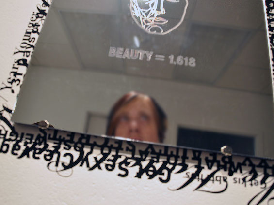 This work is a simple statement on society’s reward for beauty. It was created for a group exhibition entitled, ”The Measure of a Woman.“ The grid mask represents the measure of perfect beauty as it exists in the Fibonacci sequence (also known as the golden mean, golden ratio, or divine proportions). The mask represents a mathematical coherence found in nature that resonates with humankind. The viewer may align their face with the one in the mirror to see how they measure up. The mirror is framed with headlines from from beauty magazines.