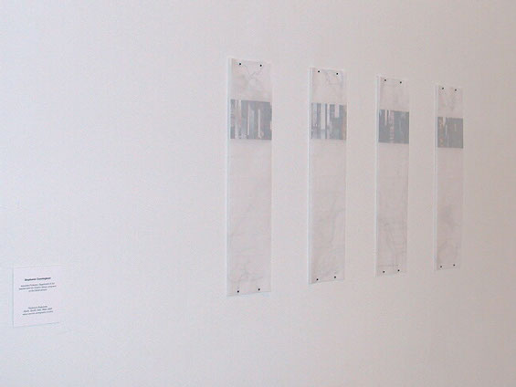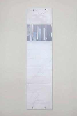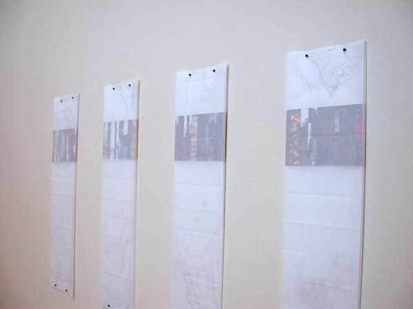 Over time the artifacts of travel pile up in the form of maps and snapshots. The locations of the snapshots used here are personally meaningful. Splices of photographs are composed in four 4 x 6 inch postcard formats that each describe a place in one of the cardinal directions. Each is partially veiled by vellum sheets that utilize a map fold to enclose them and map pins to secure them to the wall. Traced on the vellum are partial maps. The maps must be viewed by pressing the layers of vellum together. The act of interaction offers the viewer the opportunity of discovery or recognition. The scraps of information recall fragmented memories of place.