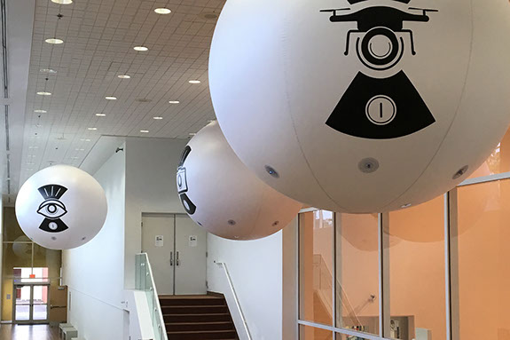 balloon depicts an all-seeing eye, the next depicts a camera, and the third depicts a drone. The lens size on each is consistent suggesting a unified force. The physical presence of the three balloons is imposing due to their large volume; the scale alone suggests authority. Yet, they are just balloons—something we usually associate with celebration and fun. The form and iconography raises the question whether the watcher is protector or punisher or even present.