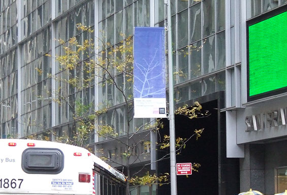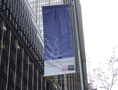 The Urban Forest Project placed 200 banners by selected designers, artists, photographers and illustrators from around the world in New York’s Times Square. Each banner used the form of the tree, or a metaphor for the tree, to make a powerful visual statement. Together they created a forest of thoughtful visual art in one of the world’s busiest, most energetic and emphatically urban intersections. visited by 30 million people each year to encourage passersby to pause, if only for a moment, to be entertained, stimulated or provoked by the work.*