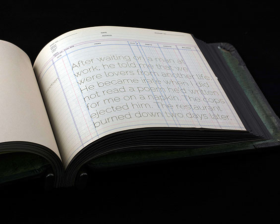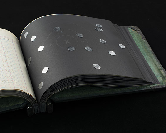Found accounting ledger, laser cut paper, lead shot, graphite.