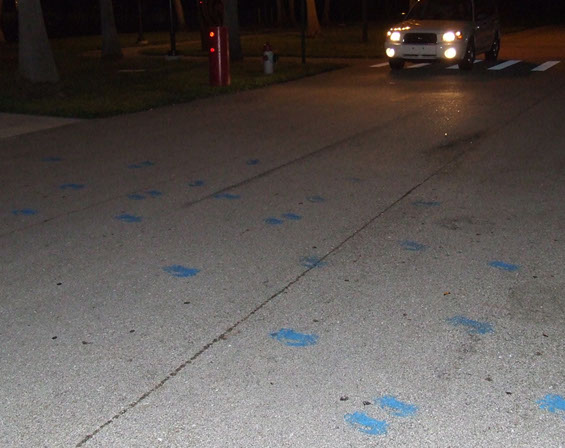 At one time blue crabs blanketed the South Florida roadways in quantities that could stop traffic. The post-war population boom and resultant loss of habitat impacted the visibility of blue crabs in the area. The Crossings project consists of dozens of blue crabs spray painted across roadways. They are painted with a temporary paint that washes away within days providing a narrow opportunity for a sighting. Painting the crabs across the road adds humor, nostalgia and whimsy to the urban environment while at the same time comments on the impact of our attempts to coexist with native species.