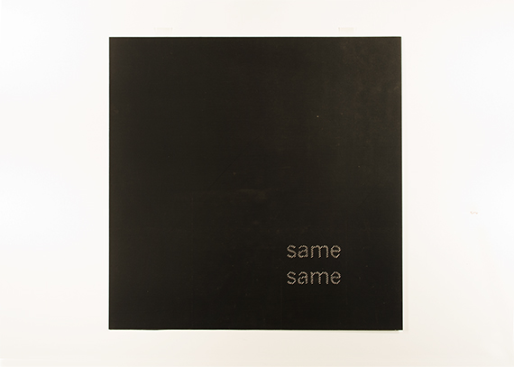 This triptych is part of a series of works on paper that explore text and the denotative power of typographic form and material choices. The distressed carbon paper, stitches, composition, and progression of text suggests an weary argument.