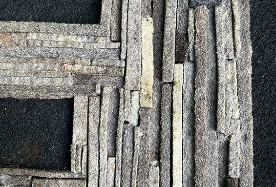 Feel is a study in grief. Scraps of felt are pieced together to capture the fractured state of grief in which we enforce order just to function. The gray colors capture the crowded thoughts of grief with occasional reliefs of color becoming more frequent.