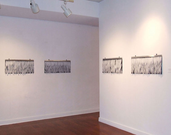 Each feather shape is individually cut from discarded plastic shopping bags and alludes to flight. The lightweight material floats with the slightest motion lending a poetic quality to the work. Each is attached to the felt by a silver brad. The row of brads alongside the aluminum bar recalls airline rivets and further alludes to flight.