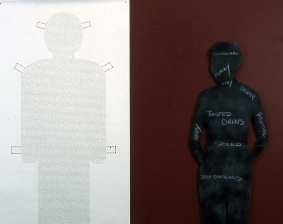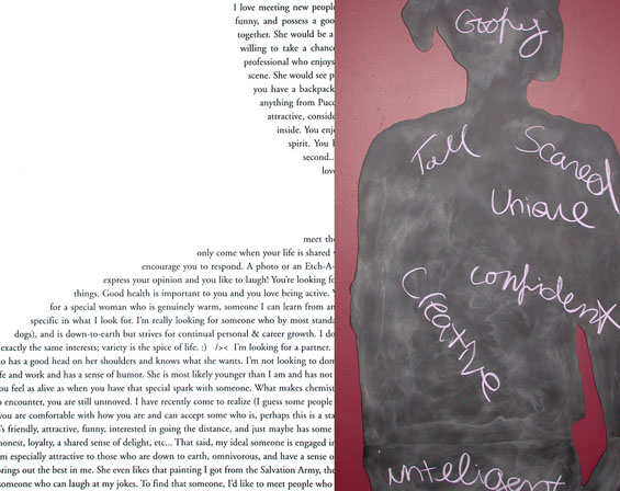 Ideal Match is inspired by the rise of on-line dating communities. In this format personalities and needs must be summed up for evaluation in less than 300 words. The work consists of four heterosexual “couples.” The man in each couple is made up of a collection of on-line descriptions of “ideal mates” written by single men that matched the criteria of the corresponding woman. These text portraits contradict the myth of the allusive bachelor by revealing his vulnerability. Each woman is the silhouette of an actual woman—her body is a chalkboard surface scribbled with words she chose to describe herself. The specific form and changeable criteria of the women allows each to exist as an evolving individual rather than a statistic. The temporary presentation of the men shifts the act of selection to the woman.