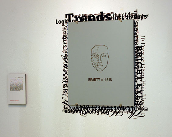 This work is a simple statement on society’s reward for beauty. It was created for a group exhibition entitled, ”The Measure of a Woman.“ The grid mask represents the measure of perfect beauty as it exists in the Fibonacci sequence (also known as the golden mean, golden ratio, or divine proportions). The mask represents a mathematical coherence found in nature that resonates with humankind. The viewer may align their face with the one in the mirror to see how they measure up. The mirror is framed with headlines from from beauty magazines.