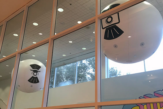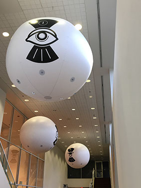 balloon depicts an all-seeing eye, the next depicts a camera, and the third depicts a drone. The lens size on each is consistent suggesting a unified force. The physical presence of the three balloons is imposing due to their large volume; the scale alone suggests authority. Yet, they are just balloons—something we usually associate with celebration and fun. The form and iconography raises the question whether the watcher is protector or punisher or even present.